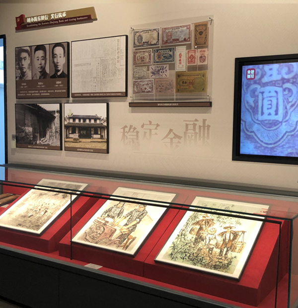 在介紹浙東銀行抗幣發(fā)行的內容前,大家看到了在櫥窗里的三幅畫,展現的是《浙東銀行成立》《抗幣印刷》《抗幣運輸》,亦系作者張鐘接受市委黨史辦下達的任務,于前幾年寫實創(chuàng)作的浙東銀行系列作品之縮小件。